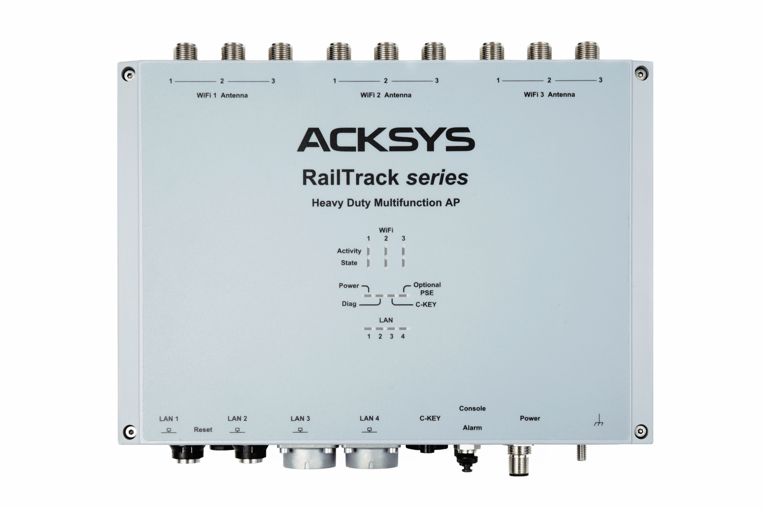 | RailTrack/RRRXB | Point d’accès WiFi triple radio, répéteur backbone et point Mesh (IEEE 802.11a/b/g/n/ac), 100 VAC à 240 VAC (connecteur M12 confectionnable inclus). Les câbles et les transmetteurs SFP doivent être achetés séparément. Les transmetteurs SFP doivent être compatibles avec la norme SFF-8472 (1000 Mbps). |